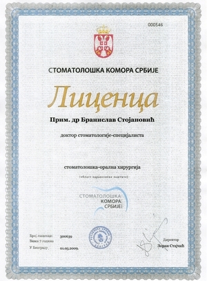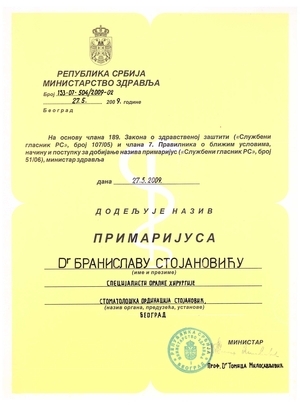 Prim. spec dr Branislav Stojanović, je specijalista oralne hirurgije, utemeljivač, prvi i jedini primarijus iz implantologije u Srbiji, sa radnim iskustvom preko 40 godina.